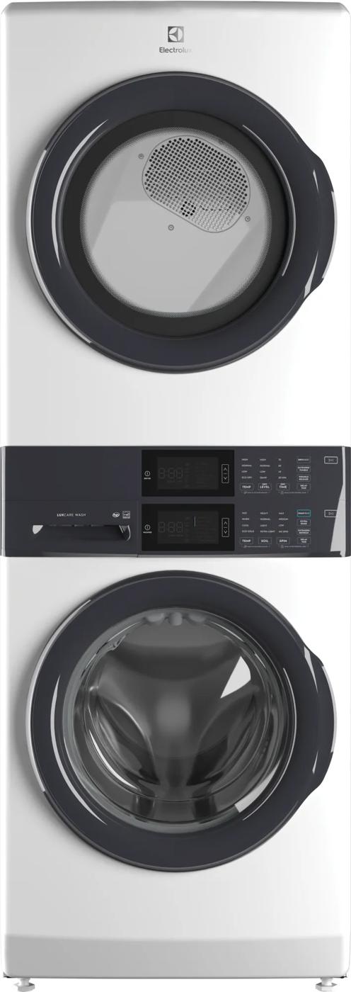 Fully integrated vertical layout takes up half the floor space of a traditional washer/dryer for greater laundry room flexibility. Features a full-sized washer on bottom, a full-sized dryer on the top, and a control panel in the middle for easy access.