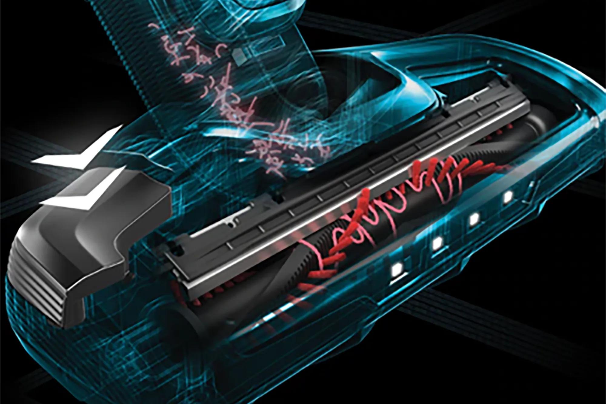 Dégagez automatiquement les cheveux et les fibres tenaces de la brosse de l’aspirateur en appuyant sur un bouton au-dessus de la buse.